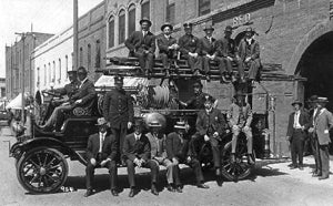 Officially, Ed Mosbough became the first paid full-time Fire Chief in 1910. He had been with the Redlands Fire Dept since October 16, 1890. That same year, the first motor driven piece of equipment was purchased, a 4 cylinder air cooled Seagraves. It had two 35 gallon soda acid chemical tanks, 150 feet of 1” chemical hose, 1000 feet of 2 ½” hose, a 24 foot extension ladder, solid rubber tires and some small tools.